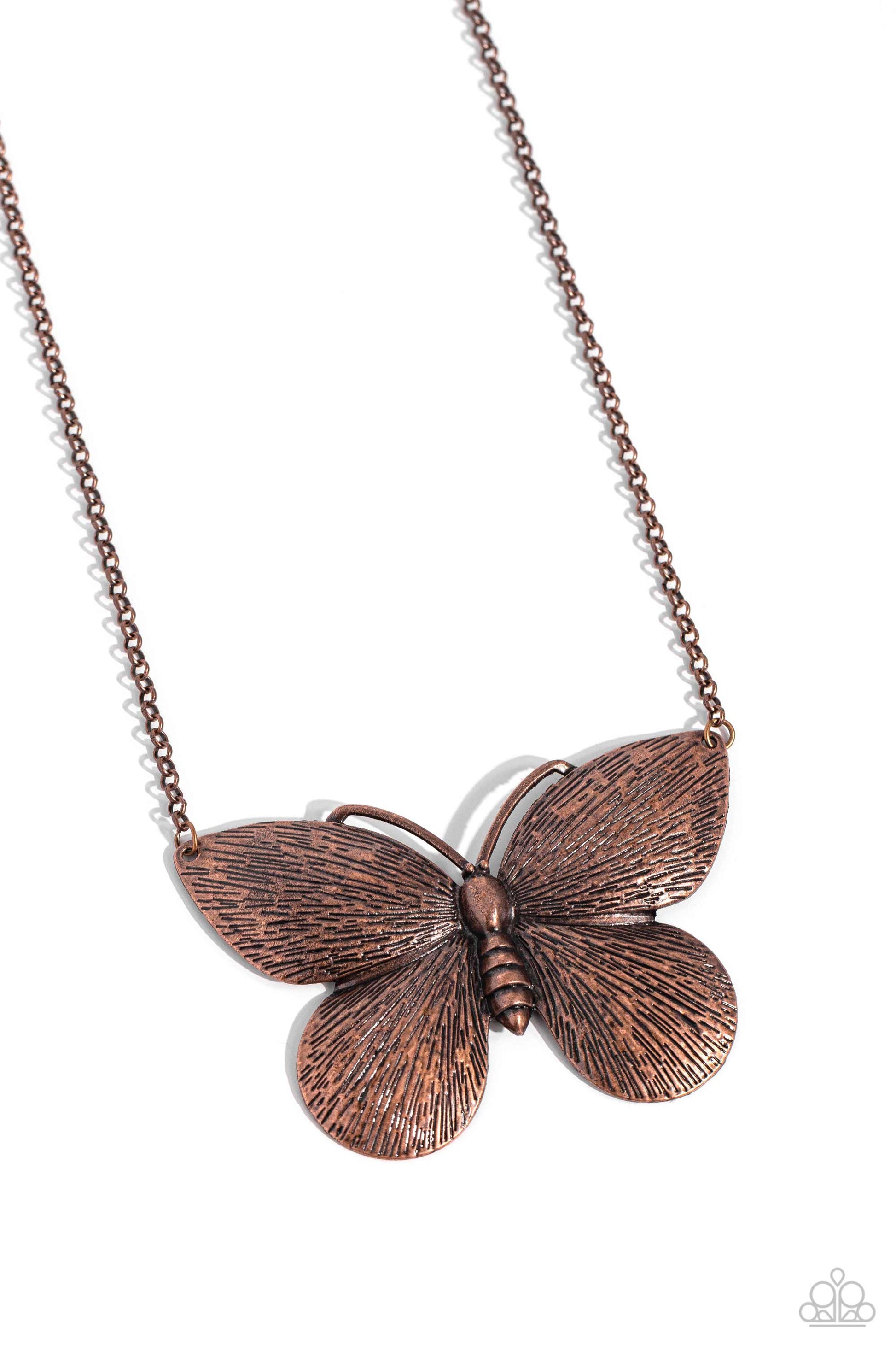 Brushed in a linear texture, an exaggeratedly large copper moth plate flutters along a copper chain below the collar for an enchanting fashion. Features an adjustable clasp closure. Sold as one individual necklace.
